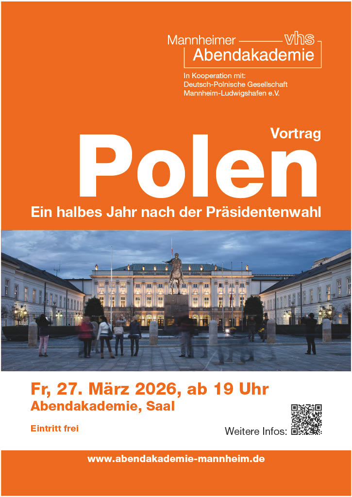 Die politische Lage in Polen nach der Präsidentenwahl am 1. Juni 2025 wird der wissenschaftliche Mitarbeiter des Deutschen Polen-Instituts in Darmstadt, Dr. Andrzej Kaluza, am Freitag, 27. März 2026, um 19 Uhr in der Abendakademie Mannheim (U1, 16-19) in einem Vortrag darstellen und analysieren. Er wird aufzeigen, wie sich die Beziehungen zwischen Deutschland und Polen nach dem Überraschungssieg des PiS-Kandidaten Karol Nawrocki entwickelt haben und sich entwickeln könnten. Nawrocki ist Europa-Skeptiker und Trump-Bewunderer; er ist bereit, mit erneuten Reparationsforderungen die Beziehungen zu Deutschland zu belasten. Innenpolitisch steht er vielfach konträr zur Regierung Tusk. Die Veranstaltung wird unterstützt von der Abendakademie und dem Förderverein Städtepartnerschaften Mannheim.