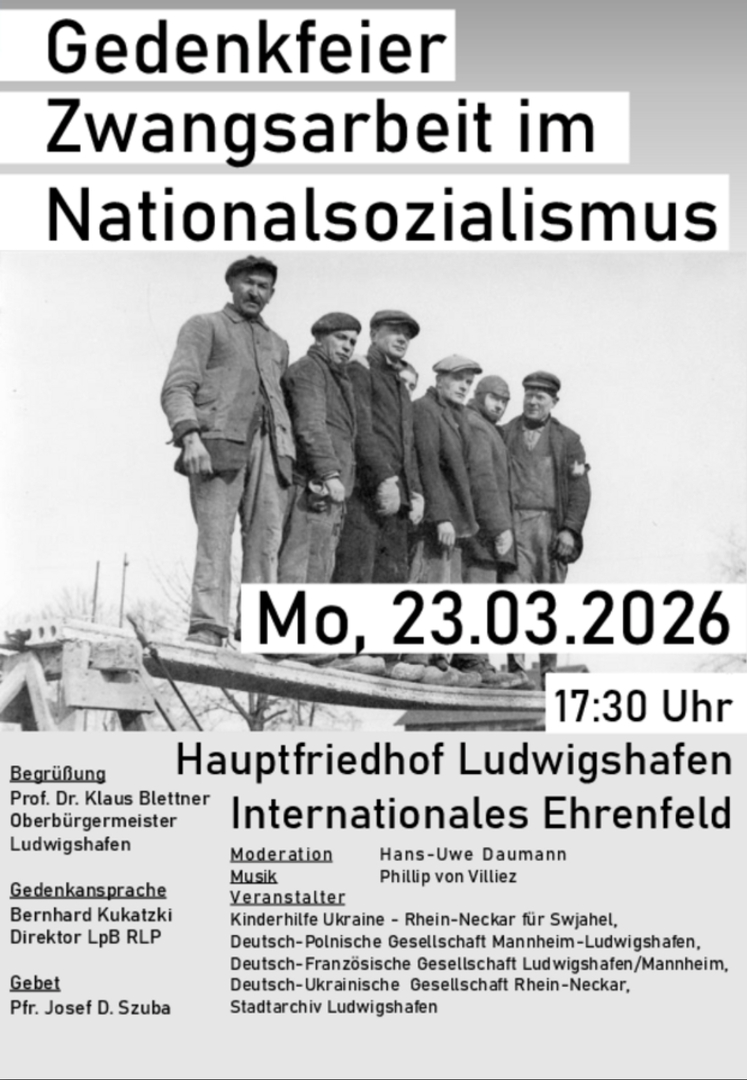In einer Gedenkfeier am 23. März 2025 auf dem Hauptfriedhof Ludwigshafen gedachten Vertreterinnen und Vertreter der Stadt sowie der beteiligten Vereine der Zwangsarbeiter und Zwangsarbeiterinnen, die an diesem Tag vor 80 Jahren von der US-Armee befreit worden waren. Die Ehrung fand auf dem Internationalen Gräberfeld statt. Oberbürgermeisterin Jutta Steinruck erinnerte an das Leid der Menschen; ihr besonderes Augenmerk galt dem Schicksal der Frauen, die häufig nicht nur als Arbeiterinnen, sondern oft genug auch von ihren Dienstherren sexuell ausgebeutet wurden. Der Vorsitzende der DPG Ma-Lu sprach ein Grußwort und legte am Ehrenmal einen Kranz nieder. Der Auftritt eines ukrainischen Chors und Gebete umrahmten die Gedenkstunde. Veranstalter waren der Internationale Bauorden in Ludwigshafen, das Kinderhilfswerk Ukraine Rhein-Neckar, die Deutsch-Polnische Gesellschaft Mannheim-Ludwigshafen, die Deutsch-Ukrainische Gesellschaft Rhein-Neckar, die Deutsch-Französische Gesellschaft Ludwigshafen/Mannheim und das Stadtarchiv Ludwigshafen.